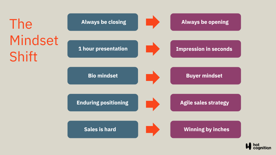 The most important shift is that your ‘buyer’ is probably not buying right now. For 80-90% of their time they are just doing their job. Your role is to find ways to create a value based relationship that helps them to solve their problems at a time and in a way that supports rather than overwhelms them.